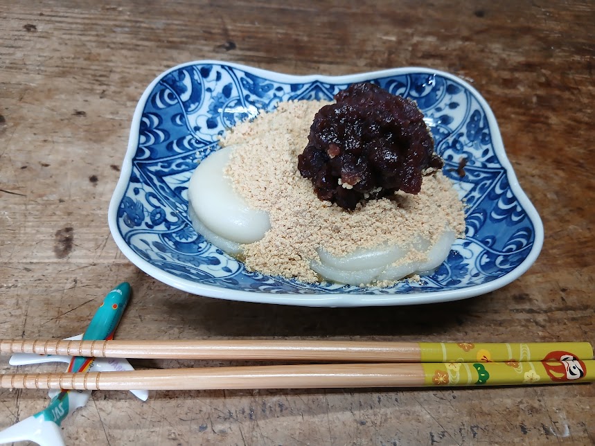 今日は1月11日で鏡開きですね。お昼ご飯にお餅をきな粉と餡子でいただきました。